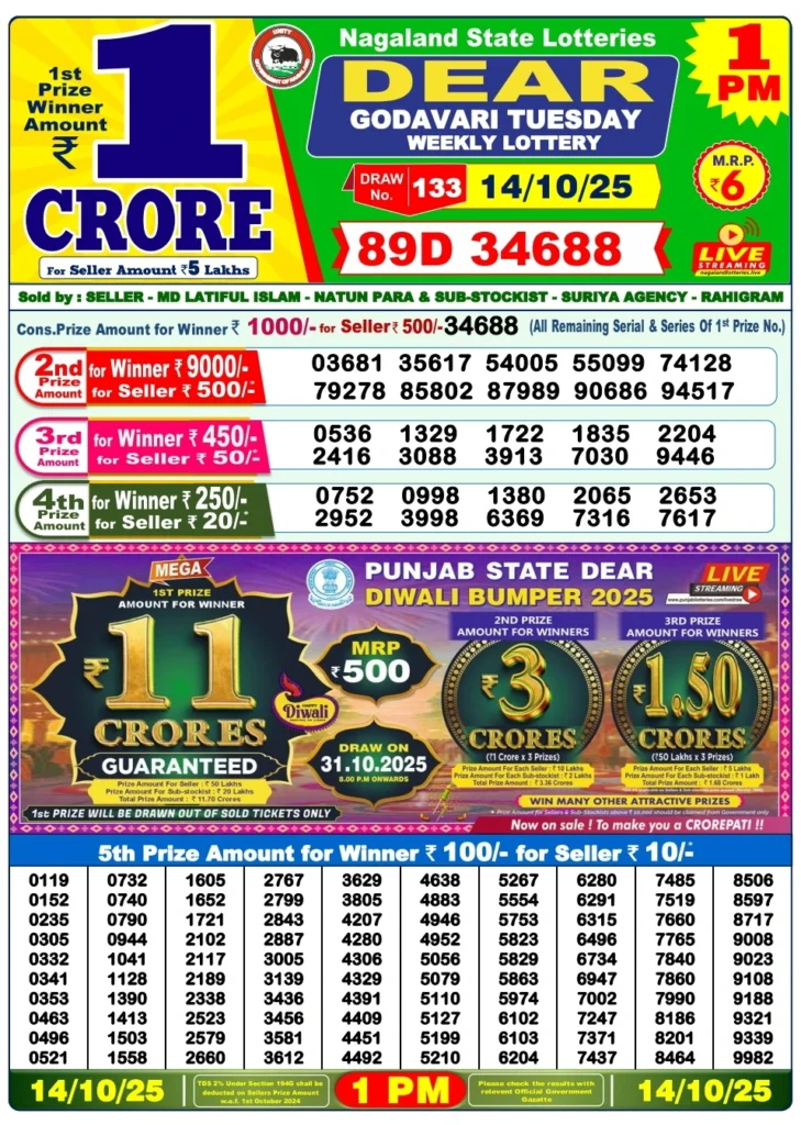 Also Check – Nagaland State Lottery Result Today 13.10.2025: Check for 1 PM, 6 PM & 8 PM