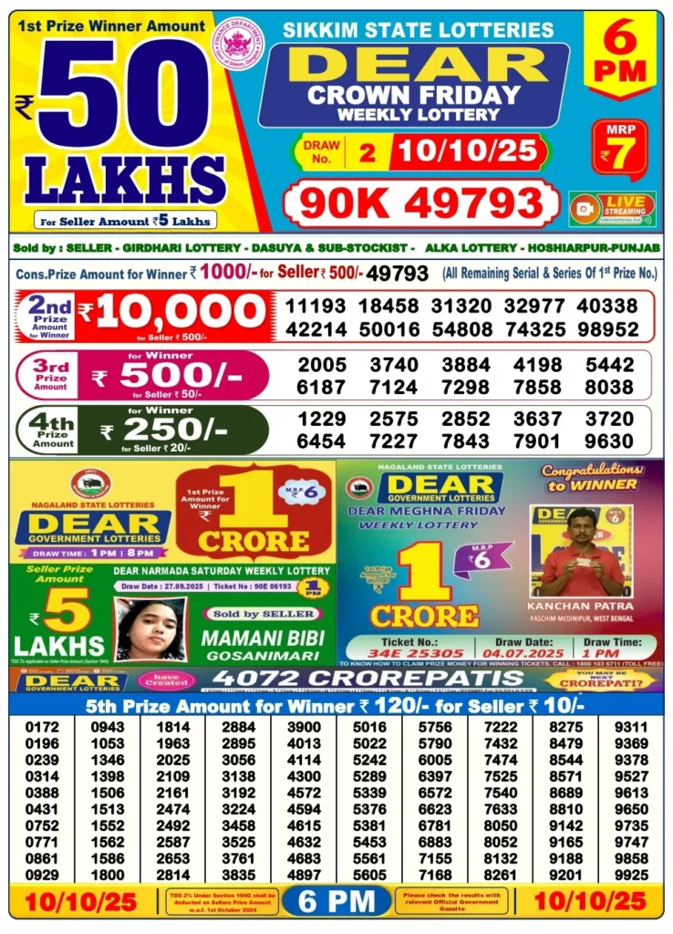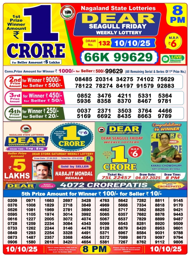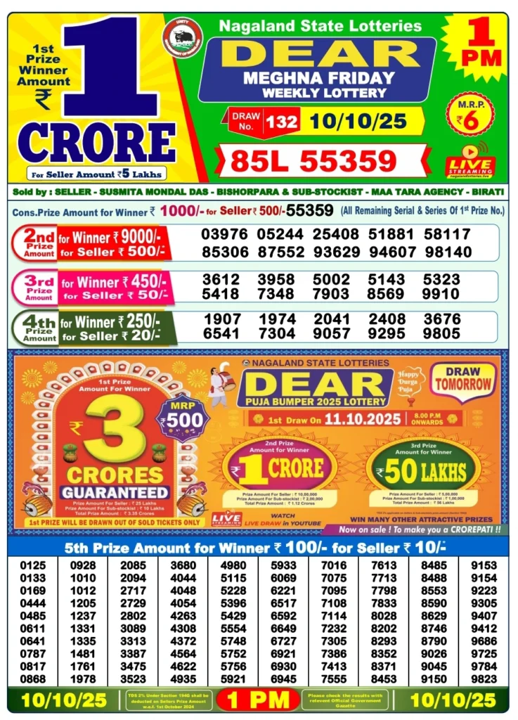 Nagaland State Lottery Result Today 10.10.2025 for 1 PM, 6 PM & 8 PM Draws