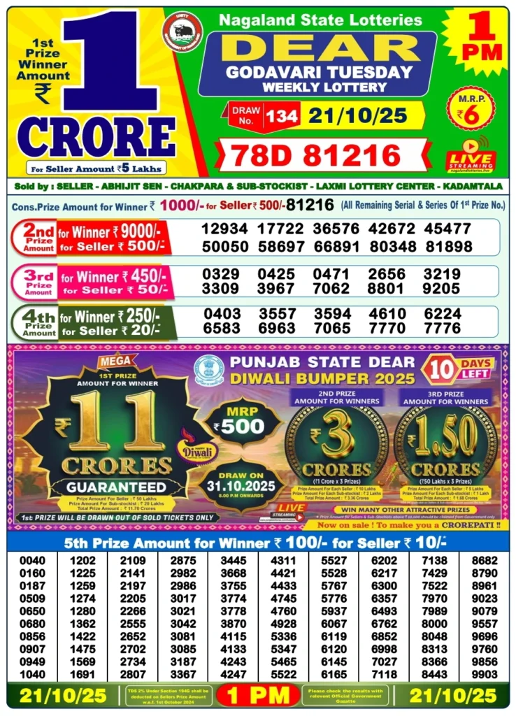 This series, with code 134, is one of the newer weekly lotteries introduced by the Nagaland government to expand the reach of its official lottery system.of Today Nagaland State Lottery Result